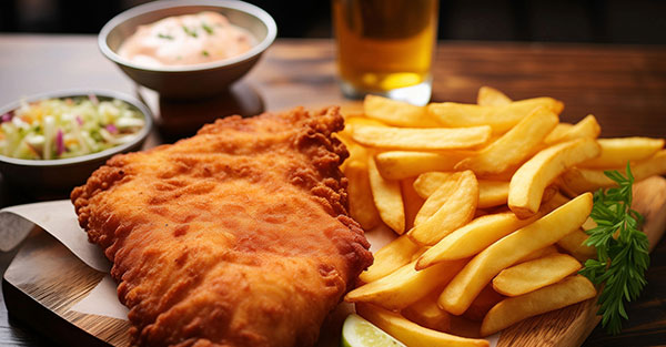 Genießen Sie knusprige Schnitzel, würzige Würste und andere köstliche Spezialitäten, perfekt kombiniert mit einer Auswahl an Golden Hops Bieren.