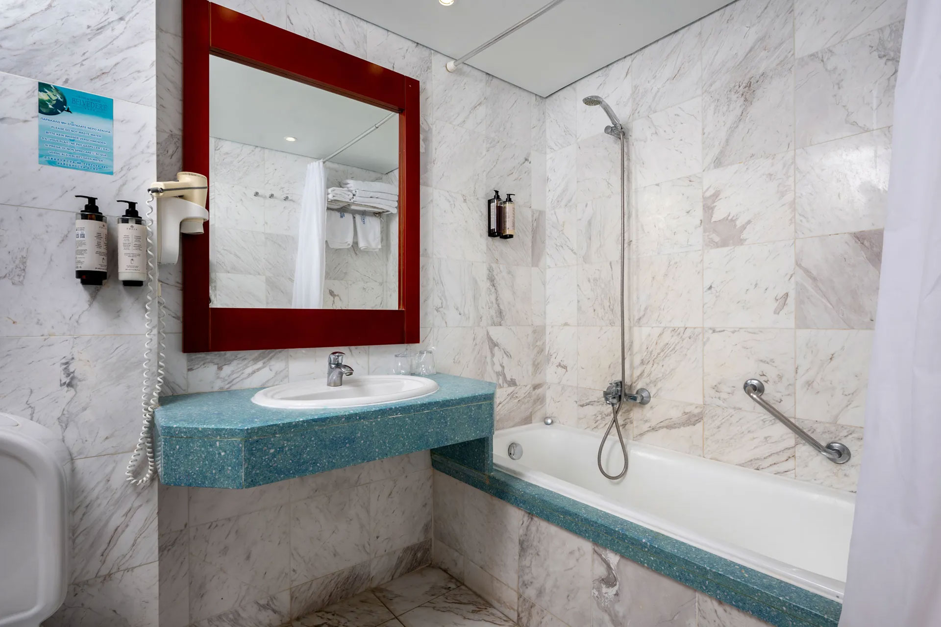 Designed for comfort and family togetherness, our 35m2 two-space Economy Family Room offers views of the gardens or partial sea views. Located on the ground floor—either in the main building or in the adjacent external blocks — this room provides a functional layout for families. The main bedroom features a double bed, while the second sleeping area includes two single beds and can accommodate up to 4 guests (2 adults). A door or sliding partition separates the two spaces for added privacy.